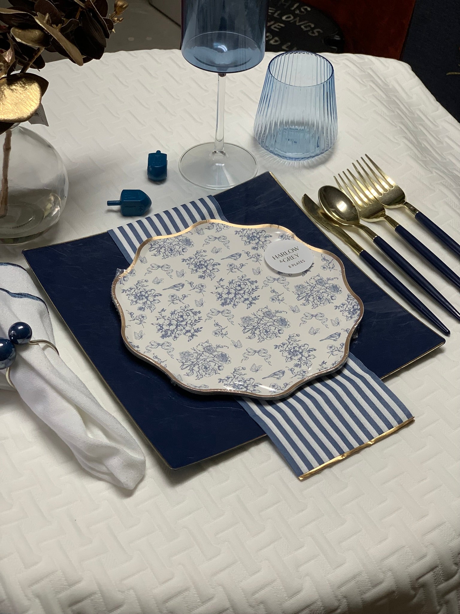 Chanuka disposable tablescape package service for 18. Includes 10 plastic dinner plates, 8 stemless 12 oz ribbed plastic cups, 8 paper salad plates(4 striped and 4 toile salad plates), 16 forks, 8 spoons, 8 knives, 15 guest towel paper napkins. Additional accessories sold separately.